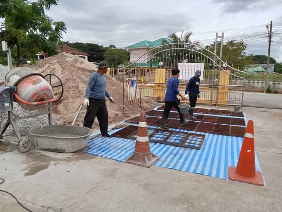 พันเอก(พิเศษ)ทวีศักดิ์ สมพงษ์ นายกเทศบาลตำบลบ้านจั่น มอบหมายให้งานป้องกันและบรรเทาสาธารณภัย เทฝารางระบายน้ำจากเดิมเป็นฝารางตะแกรงเหล็ก เป็นฝาคอนกรีต เพื่อลดปัญหาการขโมยฝาราง /...