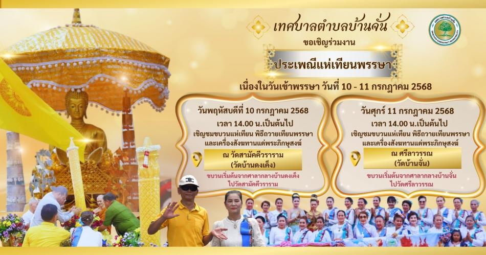 เทศบาลตำบลบ้านจั่น ขอเชิญร่วมงาน ประเพณีแห่เทียนพรรษา เนื่องในวันเข้าพรรษา วันที่ 10 - 11 กรกฎาคม 2568 .....วันพฤหัสบดีที่ 10 กรกฎาคม 2568 เวลา 14.00 น.เป็นต้นไป... [9 กรกฎาคม 2568]
