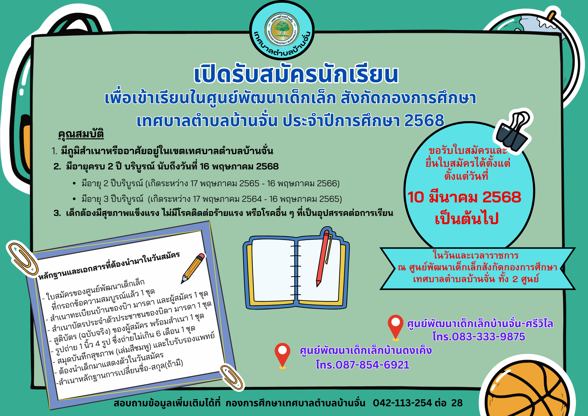#ประชาสัมพันธ์เทศบาลตำบลบ้านจั่น ***เปิดรับสมัครนักเรียนเพื่อเข้าเรียนในศูนย์พัฒนาเด็กเล็ก สังกัดกองการศึกษา เทศบาลตำบลบ้านจั่น ประจำปีการศึกษา 2568 โดยมีรายละเอียดดังนี้ คุณสมบัติของผู้สมัคร -... [13 มีนาคม 2568]