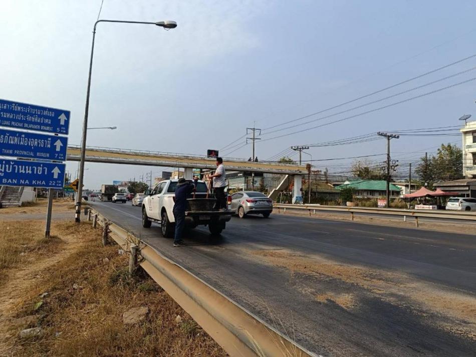 วันที่ 19 กุมภาพันธ์ 2568 งานป้องกันและบรรเทาสาธารณภัย เทศบาลตำบลบ้านจั่น โรยทรายบนถนนมิตรภาพ (อุดรธานี-ขอนแก่น) บริเวณที่มีน้ำมันรั่วไหล เพื่อดูดซับน้ำมัน และป้องกันอุบัติเหตุที่อาจเกิดขึ้น [19 กุมภาพันธ์ 2568]