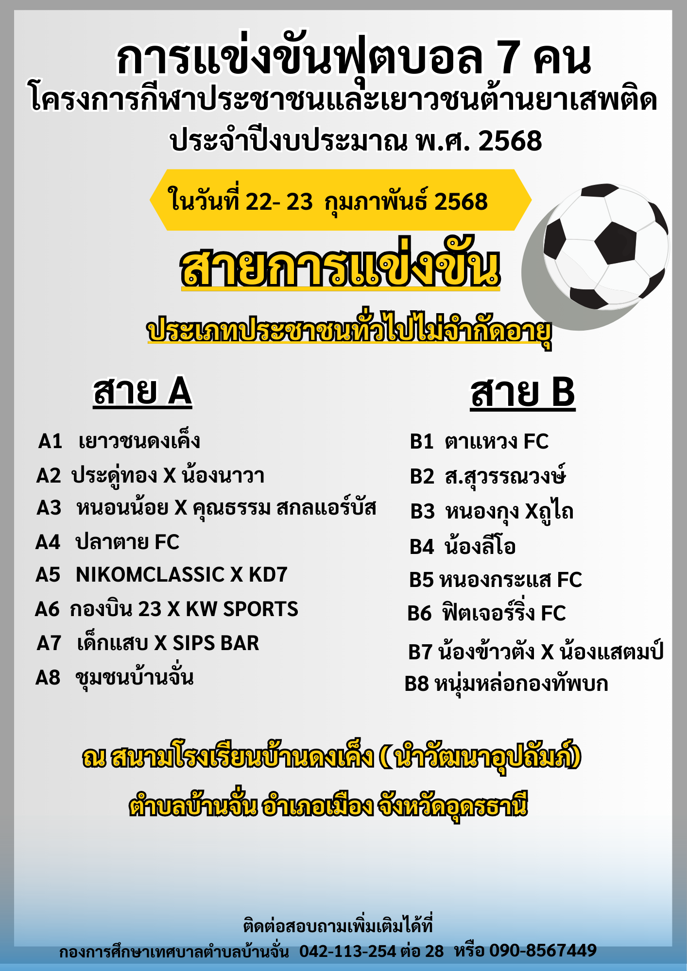 ประกาศผลการจับฉลากแบ่งสายการแข่งขันกีฬาฟุตบอล 7 คน โครงการแข่งขันกีฬาประชาชนและเยาวชนต้านยาเสพติด ประจำปีงบประมาณ พ.ศ. 2568 การแข่งจัดขึ้น ระหว่างวันที่ 22- 23 กุมภาพันธ์ 2568 ณ สนามโรงเรียนบ้านดงเค็ง ( นำวัฒนาอุปถัมภ์) ... [18 กุมภาพันธ์ 2568]